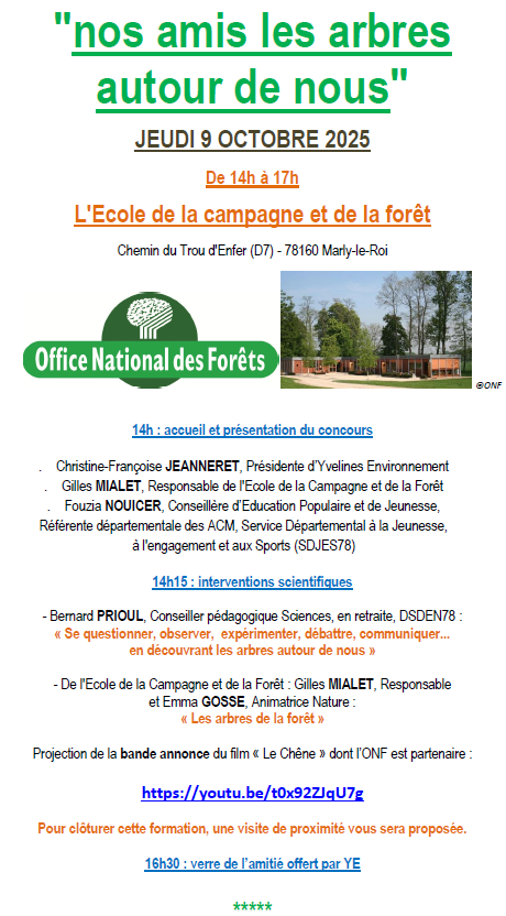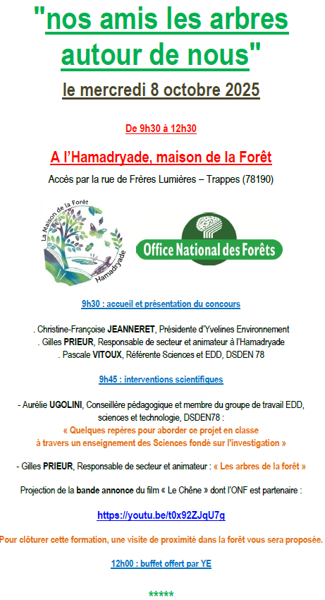 Tous nos remerciements à : Jean-Pierre GENEVIÈVE, Inspecteur d’académie, Directeur académique des services de l’Éducation nationale des Yvelines, sans lequel ce concours ne pourrait avoir lieu, ainsi qu’à Pascale VITOUX, Inspectrice de l’EN, Référente Sciences et EDD, et ses Conseillères pédagogiques, et aussi à Christophe TETARD, Chef du Service Éducation à l’Environnement à l’ONF, Gilles PRIEUR, Responsable de secteur et animateur à l’Hamadryade, Maison de la Forêt à Trappes, Gilles MIALET, Responsable de l’École de la Campagne et de la Forêt à Marly-le-Roi, et Emma GOSSE, Animatrice Nature, qui nous ont tous accueillis si aimablement sur leurs sites les 8 et 9 octobre à l’occasion de la FORMATION proposée aux enseignants, aux directeurs et animateurs des accueils de loisirs et aux éducateurs.